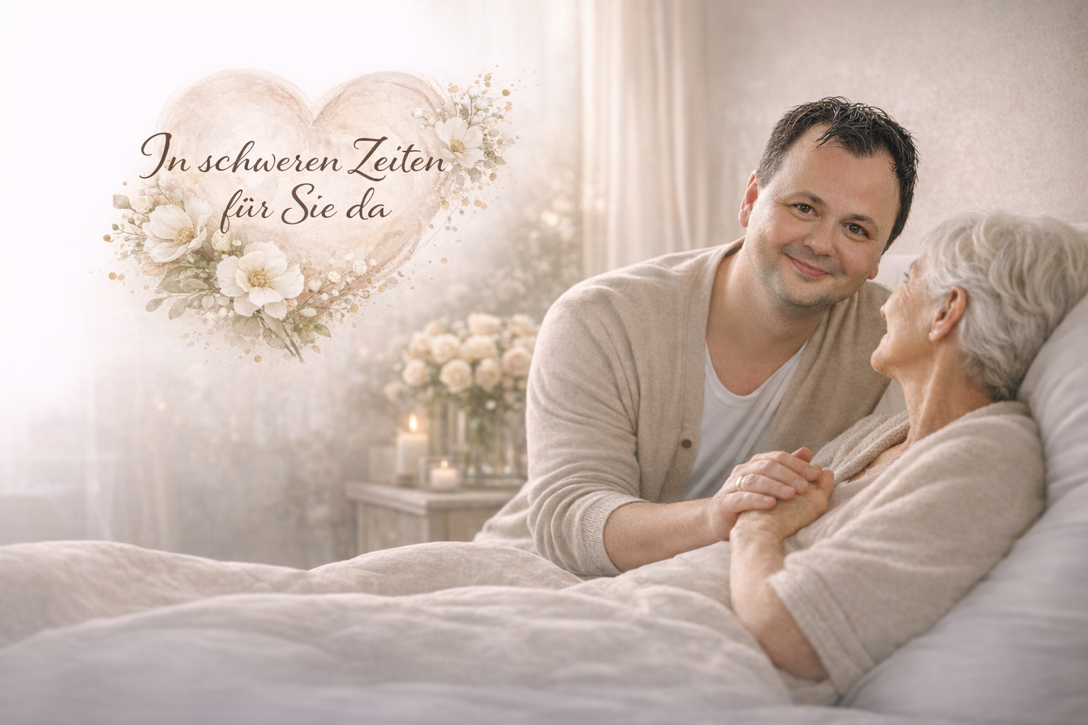 In der letzten Lebensphase begleiten ich Sie und Ihre Liebsten einfühlsam und würdevoll. Hier finden Sie Halt, Trost und Orientierung, um diese schwere Zeit gemeinsam zu meistern. Ich bin für Sie da, damit Sie sich nicht allein fühlen.